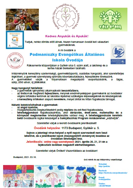 Tisztelt Szülők! Tájékoztatjuk Önöket, hogy a kormány bejelentése értelmében az óvodák és az iskolák 2021. március 8-tól (hétfő) – április 7-ig (szerda) bezárnak.Kérjük, hogy a mai napon vigyék haza gyermekük valamennyi személyes felszerelését!Az étkezés lemondásáról intézményünk gondoskodott.Kérjük, kísérjék figyelemmel honlapunkon, illetve Facebook oldalunkon megjelent tájékoztatóinkat. Erős vár a mi Istenünk!Budapest, 2021. március 05.az intézmény vezetősége